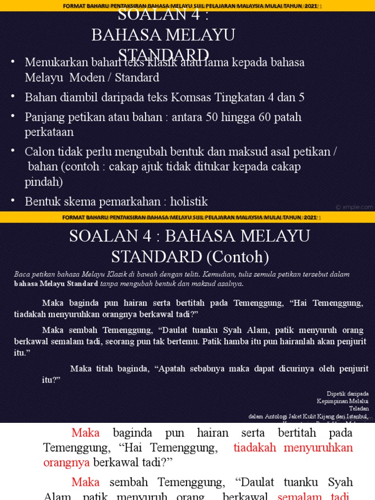 . Dalam cerita atau hikayat Melayu lama bahasa sindiran ini mudah kita temukan. Sumbangan khazanah persuratan Melayu seperti peribahasa pantun seloka mutiara kata dan sebagainya juga dialu-alukan. Baca petikan bahasa Melayu klasik di bawah dengan telitinya kemudian tulis petikan tersebut semua dalam bahasa Melayu standard tanpa mengubah bentuk dan maksud asalnya.